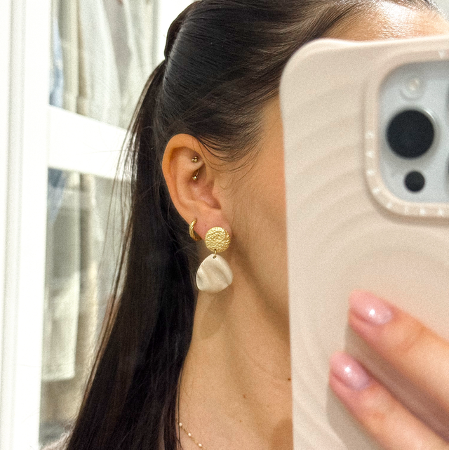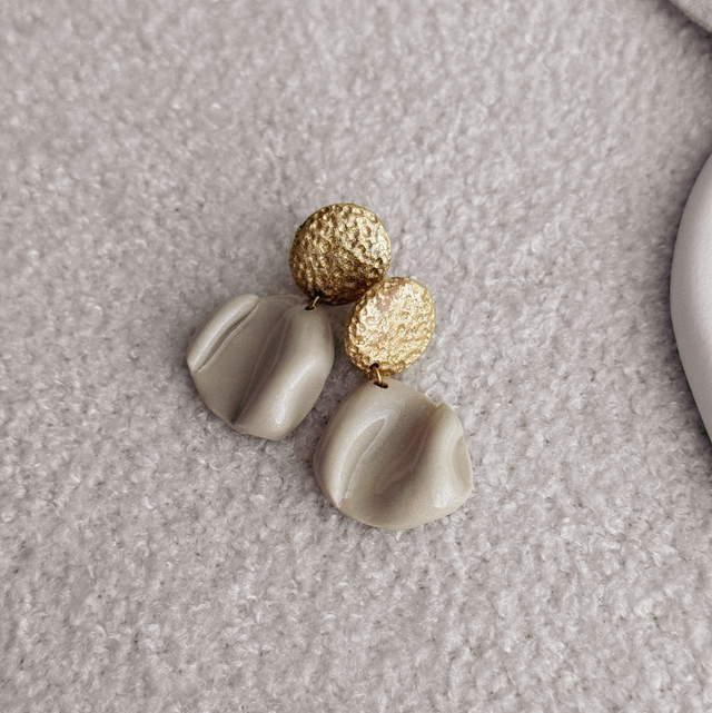 Boucles d’oreilles en effet drapé crème perlé brillant.
